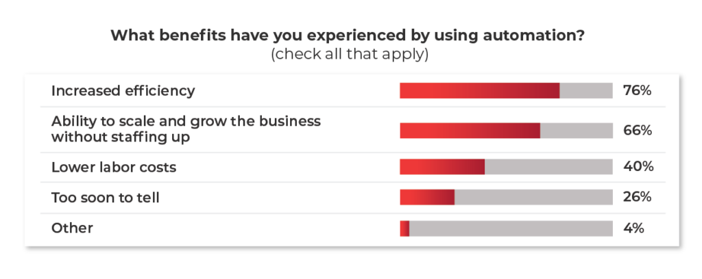 Other top benefits, according to survey respondents, are increased efficiency (76%) and lower labor costs (40%). Nearly a quarter (26%) of respondents, however, say the benefits are “too soon to tell.”