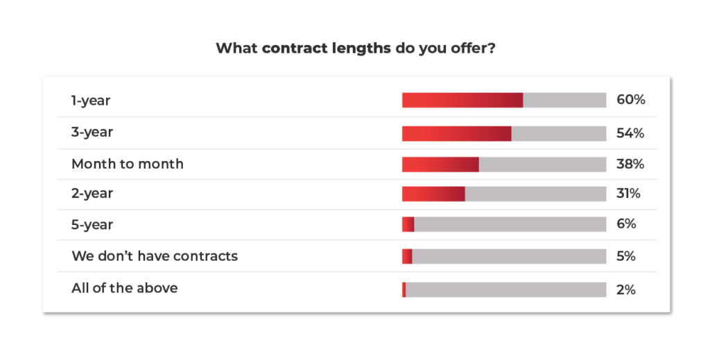 The vast majority of MSPs surveyed (95%) have client contracts. The most popular (60%) is one-year, followed by three-year (54%), and monthly (38%). Asked if they offer discounts for long-term contracts or prepayment, 45% do not, 31% do, and 24% do so sometimes, depending on the customer.