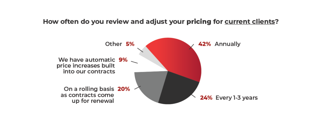 For their current clients, 42% of MPS survey respondents review and adjust pricing annually, while 20% adjust on a rolling basis as contracts come up for renewal, and 9% have automatic price increases built into the contract.