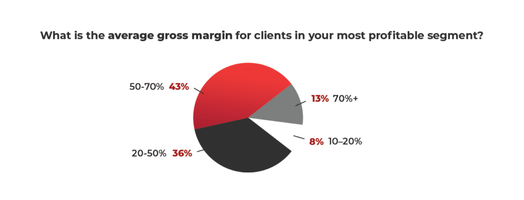 When it comes to average gross margin for their most profitable clients, 43% of survey respondents report 50-70% with another 36% getting 20-50%. Just 13% see an average gross margin above 70%, and only 8% report 10-20%.