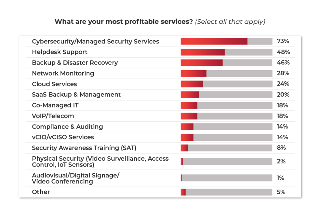 Ther most profitable services are cybersecurity and managed security services, according to 73% of respondents. Those are followed by helpdesk support (48%), backup and disaster recovery (46%), network monitoring (28%), cloud services (24%), SaaS backup and management (20%), and co-managed IT (18%).