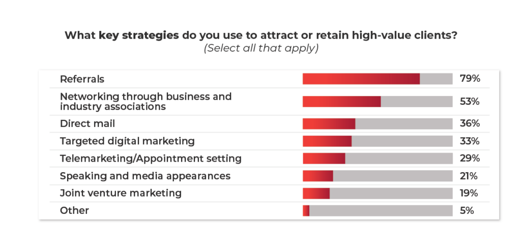 The top strategy MSPs use to attract or retain high-value clients is still referrals, according to 79% of respondents. That’s followed by networking through business and industry associations (53%). Other favored techniques include direct mail, targeted digital marketing, and telemarketing/appointment setting.